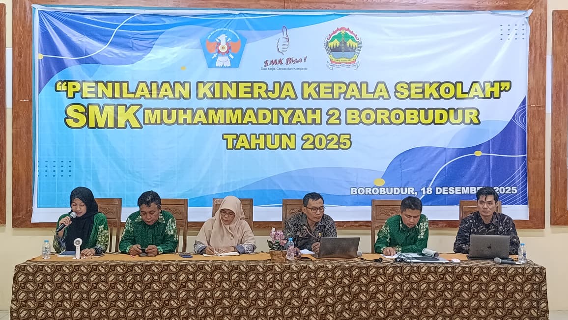SMK Muhammadiyah 2 Borobudur pada tahun 2025 kembali melaksanakan kegiatan evaluasi kinerja kepala sekolah sebagai bagian dari upaya menjaga mutu layanan pendidikan dan tata kelola sekolah yang profesional. Evaluasi ini menjadi momen penting untuk menilai capaian kinerja kepala sekolah sekaligus merumuskan langkah pengembangan sekolah ke depan agar semakin unggul, berdaya saing, dan relevan dengan kebutuhan dunia kerja.